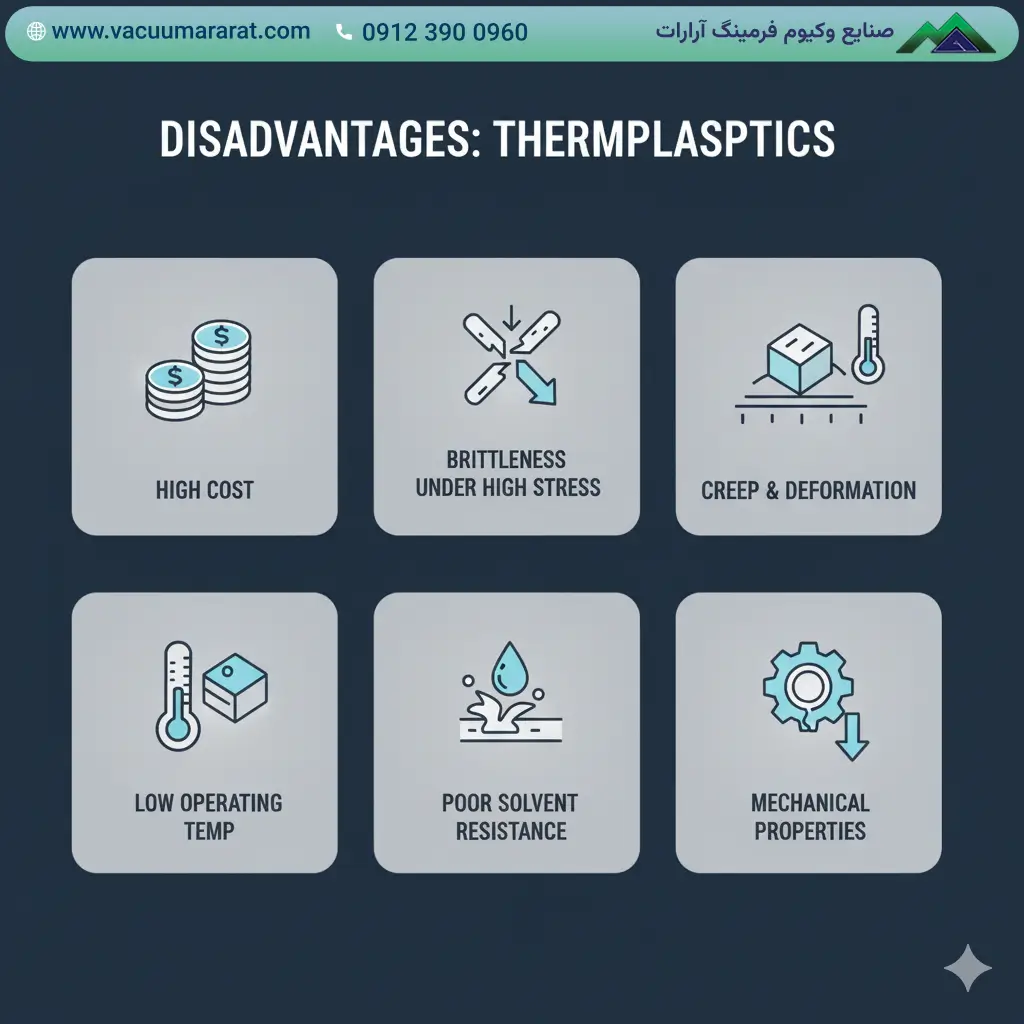با وجود مزایای فراوان، ترموپلاستیکها محدودیتهایی نیز دارند: