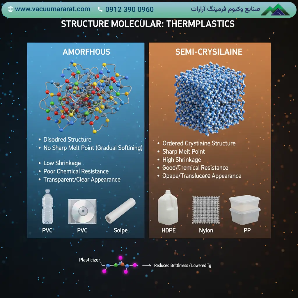 - ترموپلاستیکهای آمورف: این پلیمرها دارای ساختار مولکولی نامنظم و تصادفی هستند. آنها فاقد نقطه ذوب مشخص هستند و با افزایش دما بهتدریج نرم میشوند. ویژگیهای آمورف عبارتاند از: انقباض کم، دامنه نرمشوندگی گسترده، مقاومت شیمیایی ضعیف، چسبندگی عالی رنگ و ظاهر شفاف. این مواد چون فاقد ساختار بلورین هستند، مقاومت کمتری در برابر حملات شیمیایی و ترکخوردگی ناشی از تنشهای محیطی دارند. نمونهها شامل ABS، پلیکربنات، PVC و پلیاستایرن هستند.