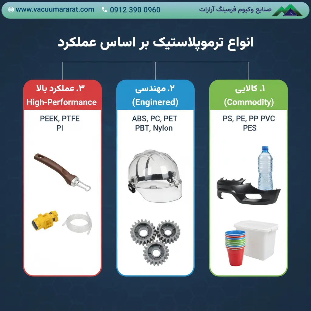 ترموپلاستیکها بر اساس کاربرد و سطح عملکرد به سه گروه اصلی تقسیم میشوند: کالایی، مهندسی و عملکرد بالا.