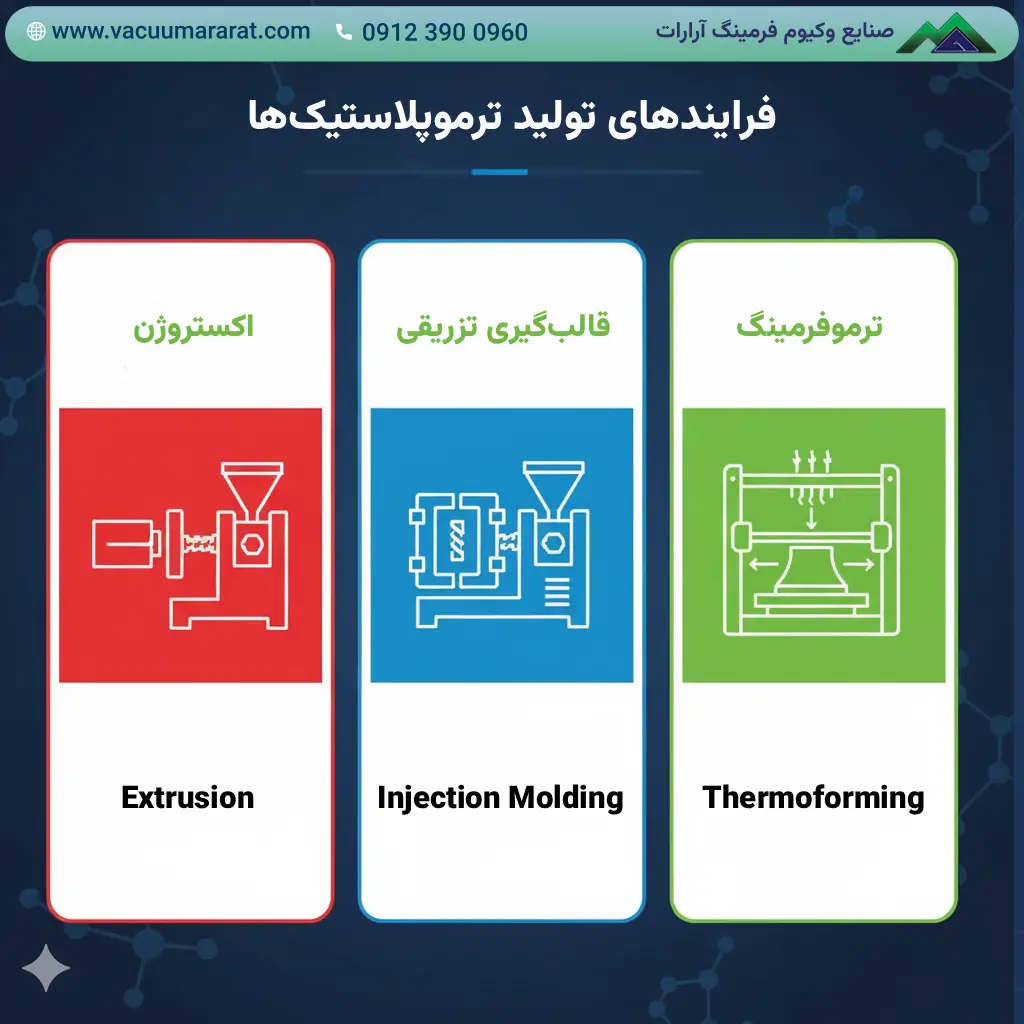 سه روش اصلی تولید محصولات ترموپلاستیک عبارتاند از قالبگیری تزریقی، اکستروژن و ترموفرمینگ.